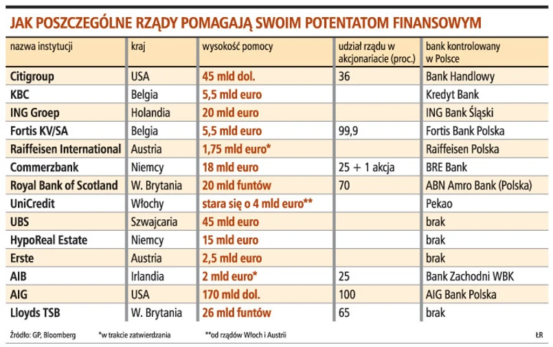Na razie najwięcej na ratowanie swoich sztandarowych do niedawna instytucji finansowych musieli wyłożyć amerykańscy podatnicy. Tylko na wsparcie Citigroup (do niedawna największej instytucji finansowej świata) oraz American International Group (największy ubezpieczyciel) amerykańska administracja wydała już 215 mld dolarów. Prezydencka administracja wzięła się też za porządki w Citigroup. Ma ona zostać podzielona na dwie części. Citicorp, która zajmie się podstawową działalnością, oraz Citi Holdings, który będzie zarządzał sięgającymi 850 mld dol. zagranicznymi aktywami. W piątek szefem tej drugiej części został mianowany Gary Crittenden, dotychczasowy dyrektor finansowy Citigroup.