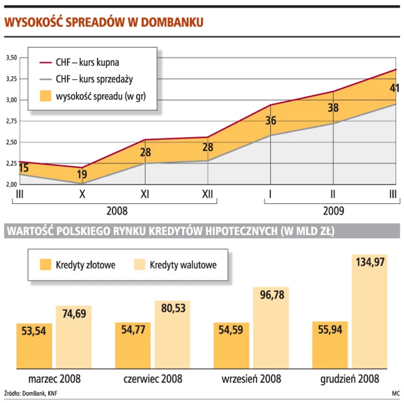 W odpowiedzi na jego oficjalne pismo bank stwierdził, że co prawda wysokość kursów ustalana jest w oparciu o dane z rynku międzybankowego, ale zależy też od obranej przez bank strategii. Bank może prowadzić odrębną politykę i ustalać własne kursy walut. Tak też się dzieje. W październiku 2008 r. różnica między kursem, po jakim można zaciągnąć kredyt w DomBanku, a tym, po jakim jest spłacany, sięgała 19 gr. W listopadzie spread wzrósł do 28 gr, a na początku marca wynosił już 41 groszy. Według przedstawicieli DomBanku spread rzeczywiście rośnie, ale proporcjonalnie do wzrostu ceny franka. Korzystając z danych dostępnych na stronie banku, można wyliczyć, że w stosunku do wartości drożejącej szwajcarskiej waluty spread w DomBanku wzrósł od października z 9,45 do 13,89 proc. Różnica jest spora. W tym samym czasie oprocentowanie kredytu spadło o prawie 2 pkt proc.