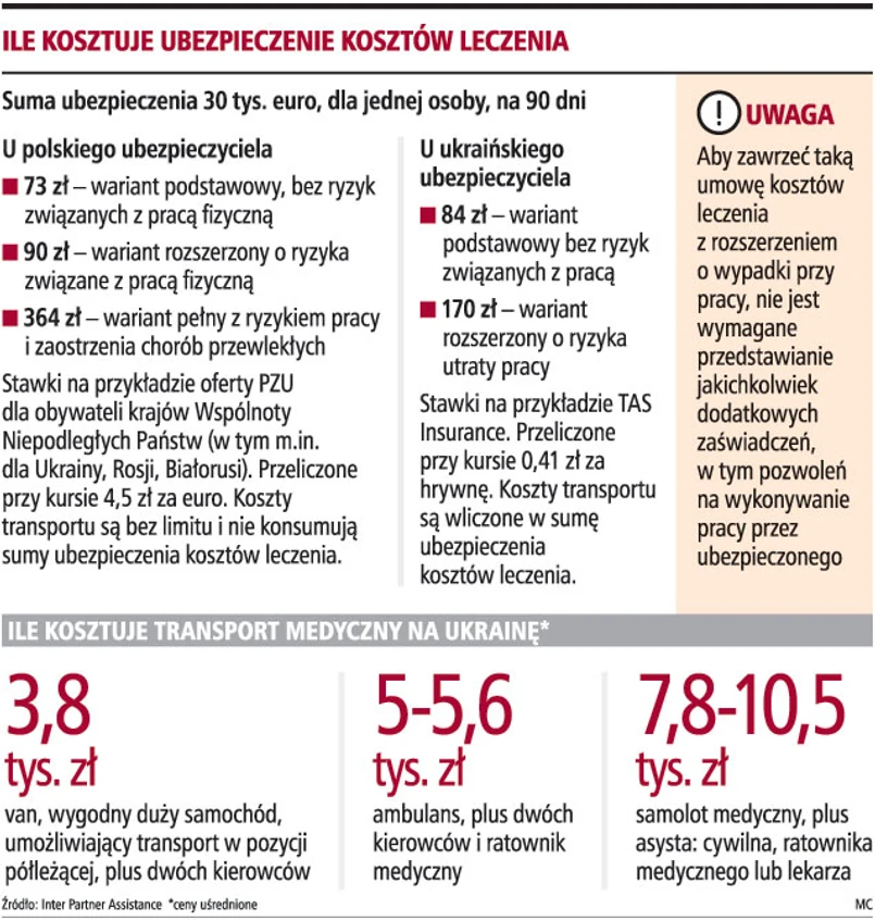 Przy zakupie polisy należy zwrócić uwagę, czy koszty transportu są określone odrębnym limitem i koszty leczenia odrębnym. Chodzi o to, żeby rosnące koszty leczenia nie stawiały ubezpieczyciela i pacjenta przed dylematem, czy pieniędzy wystarczy na ewentualny przewóz do kraju. Takie rozwiązanie jest, niestety, przyjęte w większości ukraińskich polis.