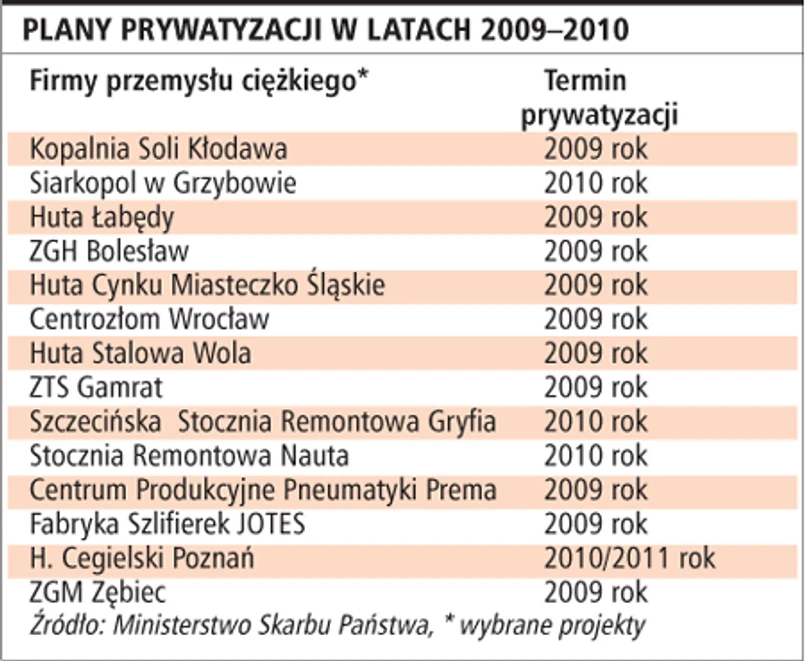 Mimo niemal 20 lat prywatyzacji rząd nadal nie jest w stanie poradzić sobie z restrukturyzacją przemysłu ciężkiego. Po najnowszej weryfikacji na listach projektów prywatyzacyjnych na lata 2008-2011 znajduje się około 120 firm przemysłu ciężkiego (chemiczny, hutniczy, obronny, maszynowy, metalowy). Z zestawienia wynika, że do sprzedania jest 36,68 proc. akcji Ciechu, czy 100 proc. akcji zakładów H. Cegielski, ale planowane jest też wniesienie bydgoskiej Belmy do wojskowego Bumaru, o którego prywatyzacji nie ma mowy. Niektórych firm zapewne nie da się ani sprzedać, ani przekształcić. W niektórych przypadkach przymiarki do prywatyzacji trwają - bezskutecznie - od lat. Resort skarbu chciałby np. zbyć 32,11 proc. akcji w Hucie Metali Nieżelaznych Szopienice, która od jesieni 2008 roku jest w likwidacji.