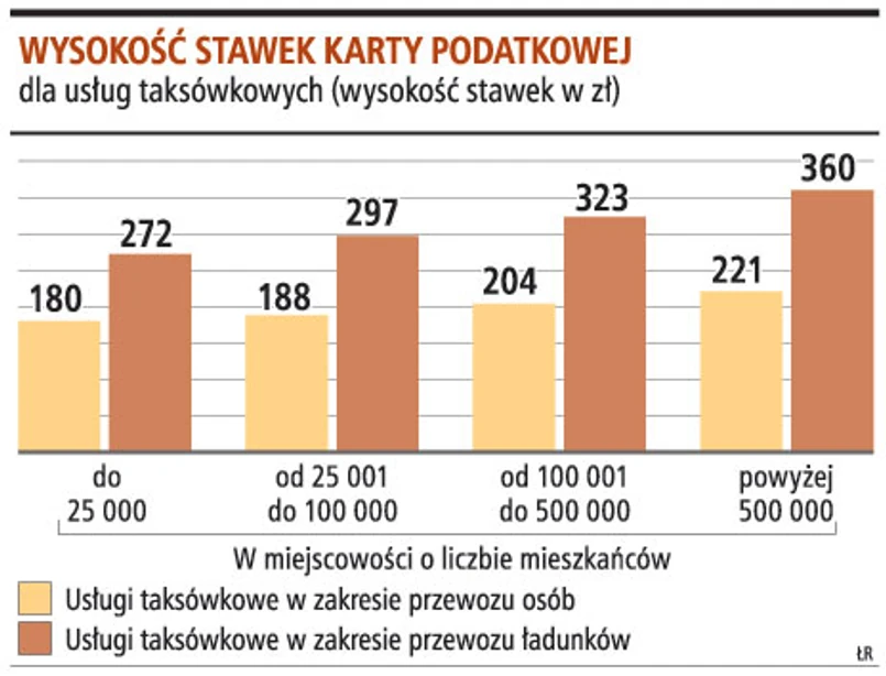 Zgodnie z tą tabelą opodatkowanie w formie karty podatkowej mogą wybrać m.in. osoby fizyczne prowadzące działalność gospodarczą polegającą na świadczeniu usług taksówkowych w zakresie przewozu osób oraz ładunków.