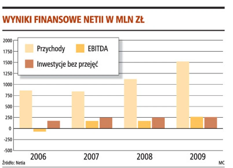 Netia podtrzymała prognozę tegorocznych przychodów na poziomie 1,52 mld zł. Podniosła za to prognozę rentowności EBITDA na następne lata. W 2010 roku marża EBITDA ma wynieść 23 proc. (poprzednia prognoza - 20 proc.), a w 2012 roku - 28 proc. (poprzednio - 25 proc.). Prezes Godlewski podtrzymuje plany kupowania lokalnych operatorów usług internetowych.