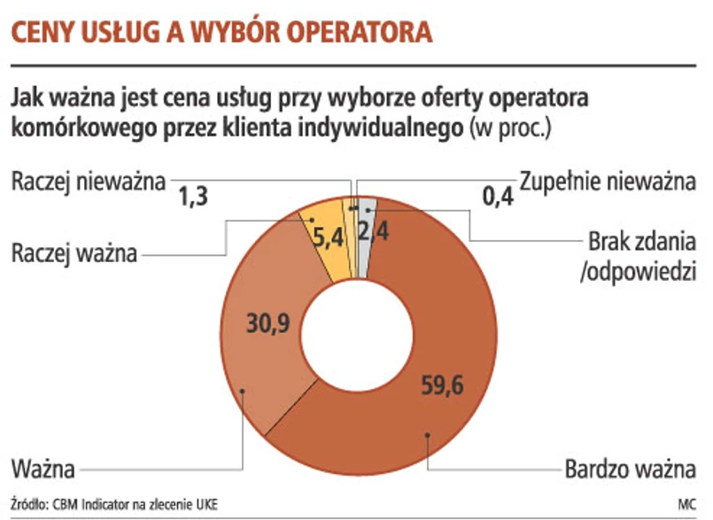 Orange zwleka, bo w sumie na tle konkurencji - jak wykazały przeprowadzone przez nas symulacje (GP nr 53 z 17 marca) - ma nadal niezłą ofertę, zwłaszcza dla klientów gotowych wydawać na usługi przedpłacone co najmniej 50 zł miesięcznie. A właśnie mniej więcej tyle - według badań przeprowadzonych na zlecenie regulatora dokładnie 53,3 zł - co miesiąc wydaje statystyczny użytkownik pre-paid.