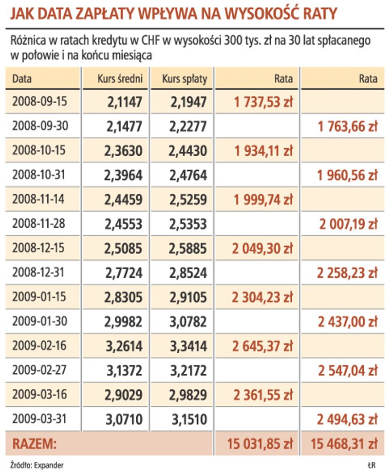 Pod koniec miesiąca ceny walut rosną. Dla osób mających kredyty nominowane w szwajcarskiej walucie duże znaczenie ma to, czy rata spłacana jest przy cenie franka wynoszącej 3,15 zł, czy też niższej niż 3 zł. Tylko w marcu osoba, która ma 30-letni kredyt nominowany we frankach w wysokości 300 tys. zł i termin spłaty w połowie miesiąca, zapłaciła o ponad 130 zł mniej niż klient, który ten sam kredyt spłaca pod koniec miesiąca. W ciągu ostatnich siedmiu miesięcy tylko w lutym zdarzyło się, że kurs franka w połowie miesiąca był wyższy niż w ostatnich jego dniach. W sumie od września, przenosząc spłatę kredytu na okolice 15 dnia miesiąca, można było zaoszczędzić prawie 450 zł. Eksperci tłumaczą wzrost cen walut pod koniec miesiąca zapadaniem opcji walutowych. KNF szacuje negatywną wycenę opcji na 9 mld zł. Są jednak eksperci mówiący o tym, że chodzi o grube kilkadziesiąt miliardów. Opcje wygasają pod koniec kolejnych miesięcy. W tym okresie firmy mające opcje walutowe muszą wymienić polską walutę na obcą, by uregulować swoje należności. To powoduje, że euro, dolar i frank drożeją. Później następuje spadek ich wartości. Zdaniem ekspertów większość opcji wygasa do lipca.