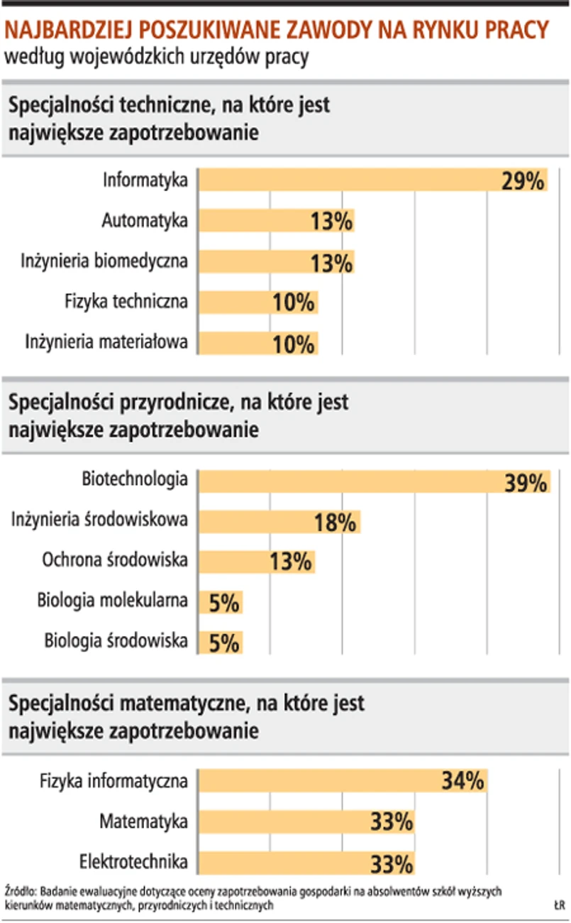 Ministerstwo Nauki i Szkolnictwa Wyższego przygotowało, na podstawie danych nadesłanych z wojewódzkich urzędów pracy (WUP) z całej Polski, raport dotyczący przewidywanego zapotrzebowania na absolwentów szkół wyższych z kierunków matematycznych, technicznych i przyrodniczych. Współpracujący z urzędami pracy przedsiębiorcy wskazali w nim przedstawicieli najbardziej poszukiwanych zawodów.