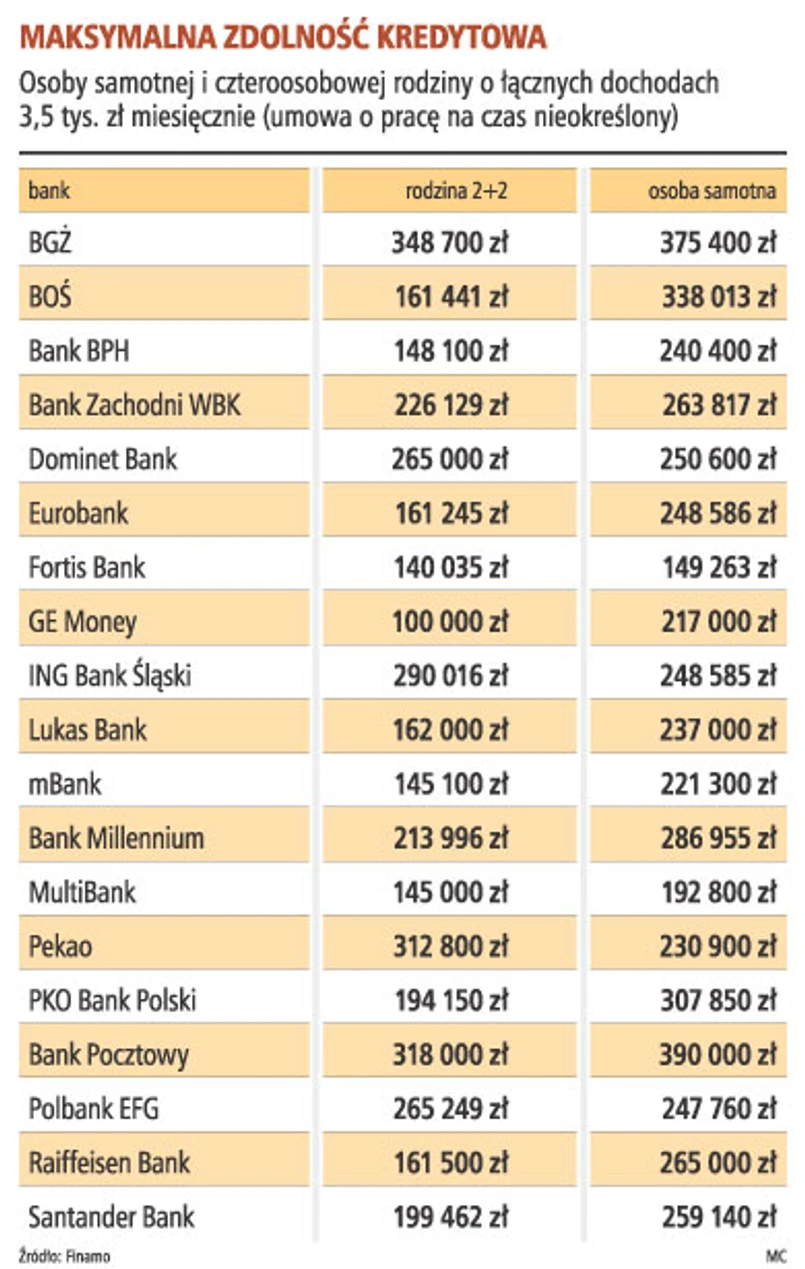 Przeciętna rodzina o dochodach 3,5 tys. zł na największy kredyt złotowy, powyżej 300 tys. zł, może liczyć w BGŻ i Pekao. Singiel, który ma takie same dochody, ma większy wybór. Pożyczkę 300-400 tys. zł może otrzymać w Banku Pocztowym, BGŻ, BOŚ i PKO BP.