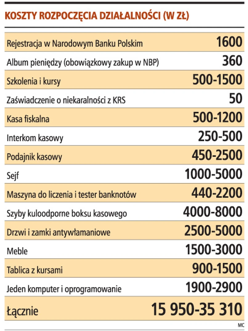 Na kantor wystarczy już 5 mkw. Przepisy obligują, by znalazła się tam tablica z kursami walut, a na szybie kasy, bądź na ścianie - w widocznym miejscu - należy wygospodarować miejsce na ekspozycję bieżących komunikatów NBP zawierających informacje o walutach obcych, będących przedmiotem obrotu. Warto zadbać o komputer ze specjalnym oprogramowaniem i dostępem do internetu - konieczny jest stały dostęp do bieżących notowań międzybankowych kursów z rynku forex. Potrzebne są kasa fiskalna, liczarka banknotów, tester i meble (szafka na dokumenty, biurko, krzesło). Niezbędne są zabezpieczenia: szyby kuloodporne, drzwi antywłamaniowe, interkom kasowy, szuflada do podawania gotówki, sejf. Za takie podstawowe wyposażenie zapłacimy co najmniej 16 tys. zł. Powinniśmy liczyć się jednak nawet z dwa razy większymi wydatkami. Jeśli chcielibyśmy zamontować system alarmowy, monitoring i skorzystać z usług firmy ochroniarskiej (miesięcznie ok. 200 zł), należy doliczyć około 10 tys. zł.