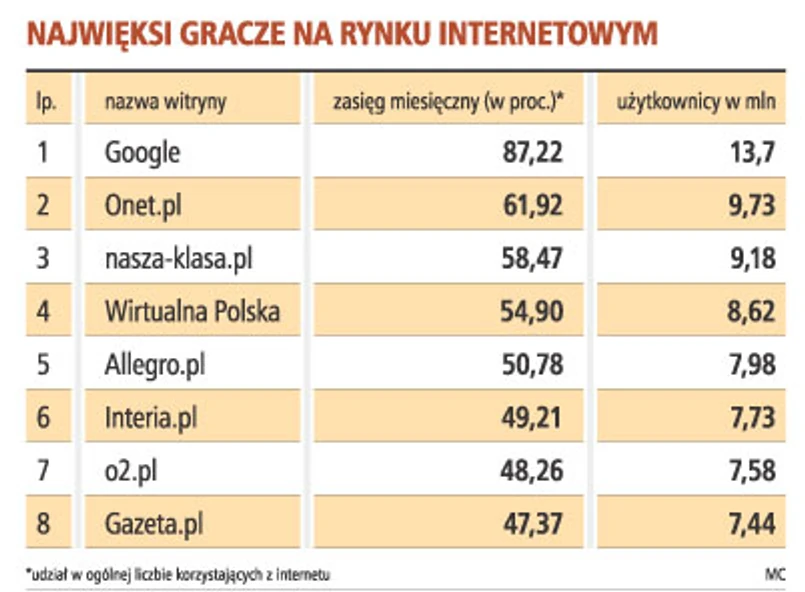 Wolniejszy wzrost rynku reklamy internetowej spowodowany spowolnieniem gospodarki najmniej martwi duże portale - Onet.pl, Wirtualną Polską, a także nieco mniejsze Interię, o2.pl i Gazetę.pl. Reklamodawcy zaczynają zachowywać się na rynku internetowym podobnie jak na rynku telewizyjnym - chętniej wybierają oferty dużych portali, gwarantujących największy zasięg i dotarcie do największych grup klientów, a do tego potrafiących kusić rabatami i szerokimi ofertami. Dlatego w I kwartale wydatki reklamowe części branż w niektórych portalach wzrosły nawet o 30 proc.