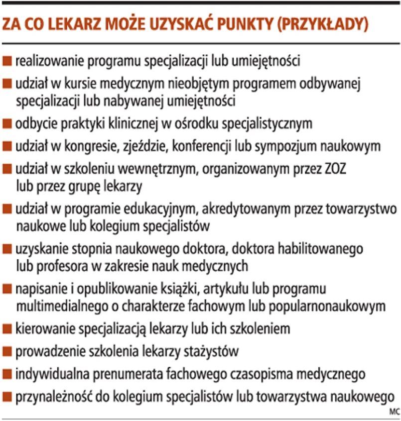 Ustawa o zawodzie lekarza oraz kodeks etyki lekarskiej stanowi, że lekarze i dentyści są grupą zawodową, która ma obowiązek stałego dokształcania się i podnoszenia kwalifikacji. Muszą to jednak robić na własny koszt, często rezygnując z części urlopu. Jak ma być realizowany wspomniany obowiązek, określa rozporządzenie ministra zdrowia. Zgodnie z nim za określone działania służące podnoszeniu kwalifikacji lekarze mają przyznawane punkty edukacyjne. W okresie czteroletnim powinni ich uzbierać 200. Weryfikacją uzbieranych punktów zajmują się okręgowe izby lekarskie.