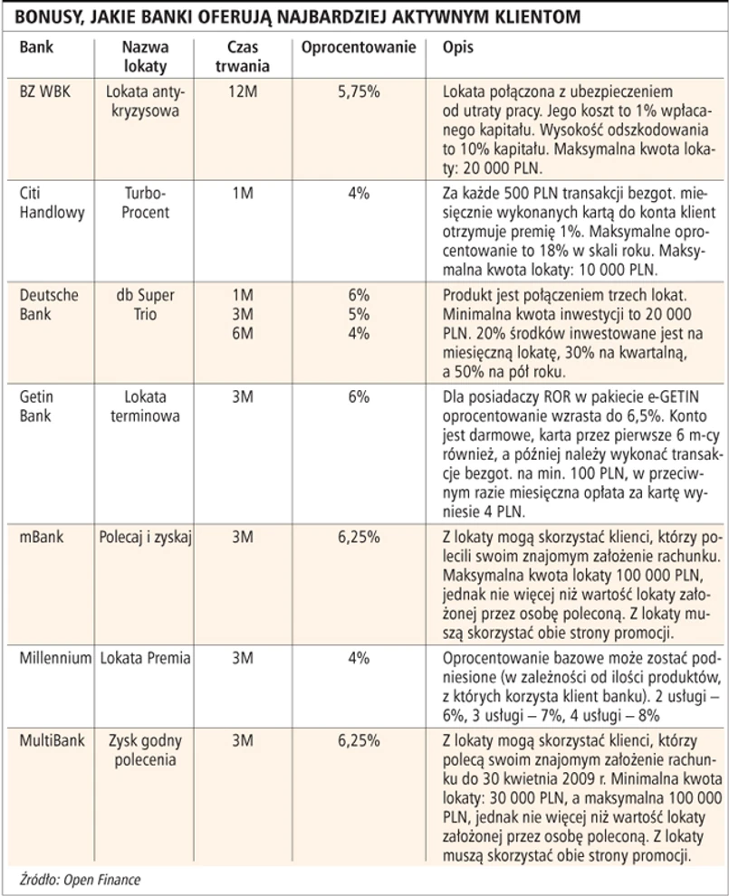 W Getin Banku na wyższe odsetki może liczyć tylko osoba, która założy w nim konto internetowe. Za taki rachunek nie zapłaci ani grosza, o ile korzysta jeszcze z karty kredytowej. W BZ WBK każdy, kto od poniedziałku założy lokatę, może otrzymać ubezpieczenie od utraty pracy. Koszt takiego ubezpieczenia to 1 proc. wartości lokaty (składkę tę pobiera się przy założeniu depozytu). W zamian w razie utraty pracy można dostać 10 proc. zdeponowanej kwoty, czyli maksymalnie 2 tys. zł odszkodowania.