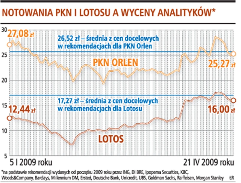 Marcin Palenik z Millennium DM szacuje, że w I kwartale strata netto PKN wyniesie 730 mln zł, a Lotosu 322 mln zł. Paweł Burzyński z DM BZ WBK zakłada 662 mln zł straty netto PKN i 643 mln zł Lotosu. Do publikacji wyników przez Lotos i zakończenia przez PKN Orlen negocjacji z bankami o aneksowaniu niektórych umów kredytowych, analitycy zalecają ostrożność.