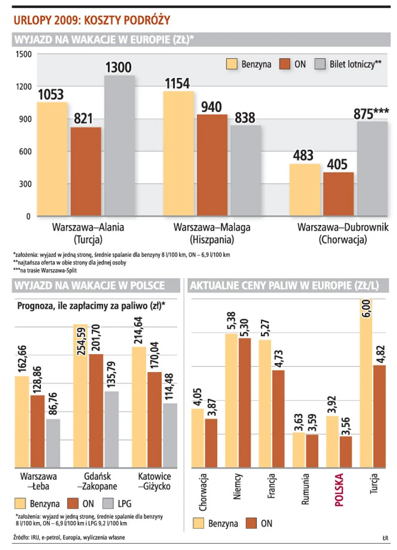 Opłacalna może być podróż samochodem np. do Chorwacji. Najtańsze bilety w sezonie letnim do Splitu kosztują zazwyczaj poniżej 1700 zł (dla dwóch osób dorosłych, w obie strony). Przejechanie z Warszawy do Dubrownika (1586 km), które powinno nam zająć tylko 25 godzin, będzie znacznie tańsze. Za paliwo w przypadku aut osobowych zasilanych olejem napędowym zapłacimy ponad 810 zł, tankowanie pojazdu z silnikiem benzynowym kosztować będzie nas średnio 966 zł.