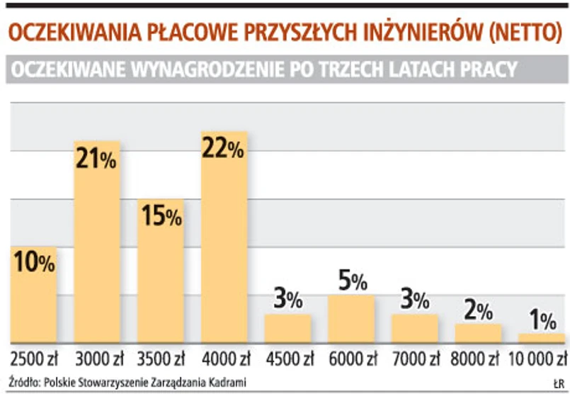 Niemal analogicznie pod względem rozkładu procentowego wyglądają wymagania płacowe przyszłych inżynierów odnośnie ich pierwszej pracy.