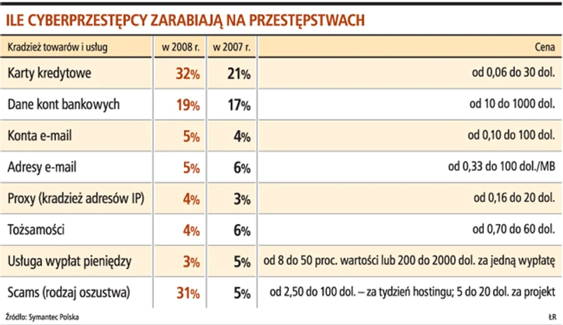 Tymczasem za każde wykradzione hasło do kart kredytowych cybeprzestępcy dostają dziś na czarnym rynku nawet 30 dolarów - wynika z najnowszego raportu firmy Symantec (producenta oprogramowania antywirusowego) o zagrożeniach bezpieczeństwa pochodzących z internetu. Za dane z kont bankowych czarny rynek płaci hakerom jeszcze więcej - nawet 1000 dolarów. Za hasła do kont e-mailowych złodziej może otrzymać do 100 dolarów, a za skradzione tożsamości (np. w serwisach społecznościowych czy grach wideo on-line) - do 60 dolarów. Lista towarów, które można ukraść w sieci, jest jednak znacznie dłuższa.