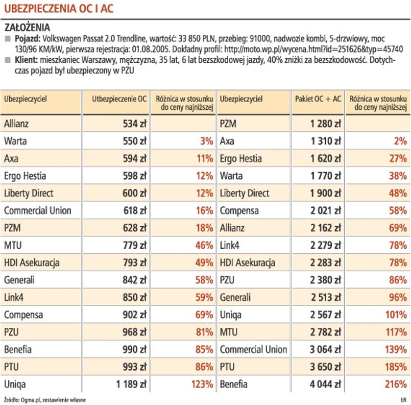 Ceny ubezpieczeń dla tego samego profilu kierowcy, samochodu i miejsca zamieszkania mogą się różnić w zależności od towarzystwa nawet o ponad 200 proc. przy pakiecie OC i AC i o ponad 100 proc. w przypadku samego OC – wynika z badania taryf firmy Ogma, monitorującej rynek ubezpieczeniowy. Zestawienie nie pokazuje, które towarzystwo jest najtańsze, ale które ma najtańszą ofertę dla danego klienta i auta. Jeśli zmienimy te parametry, wyniki będą inne. – Nie ma najtańszego ubezpieczyciela dla wszystkich– mówi Wojciech Rabiej z porównywarki rankomat.pl. Z badań przeprowadzonych przez jego firmę wynika, że różnice w cenie identycznej polisy przekraczają 200 proc.