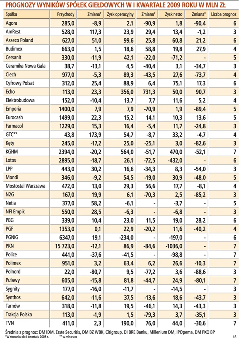 Spośród 37 niefinansowych spółek giełdowych, dla których zebraliśmy prognozy (36 prezentowanych dziś i Telekomunikacja Polska, której oczekiwane wyniki przedstawiliśmy w poniedziałek), 28 miało w I kwartale 2009 r. zysk netto niższy niż rok wcześniej. Pogorszenie zysku operacyjnego spodziewane jest w 25 firmach, zaś spadek przychodów w 18.