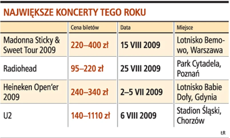 Madonna, U2, Depeche Mode, Radiohead... To największe gwiazdy, które odwiedzą w tym roku Polskę. Na Madonnę, która wystąpi w sierpniu, część biletów jest już wyprzedana, w tym te najdroższe, kosztujące 1110 zł. – Nazwiska i nazwy mówią same za siebie. Kryzys może jest w bankach, w nieruchomościach czy niektórych branżach produkcyjnych. Ale nie na rynku koncertowym – dodaje Piotr Muranty, prezes Grupy Stereo.pl, do której należy sprzedający bilety serwis Bileteria.pl.