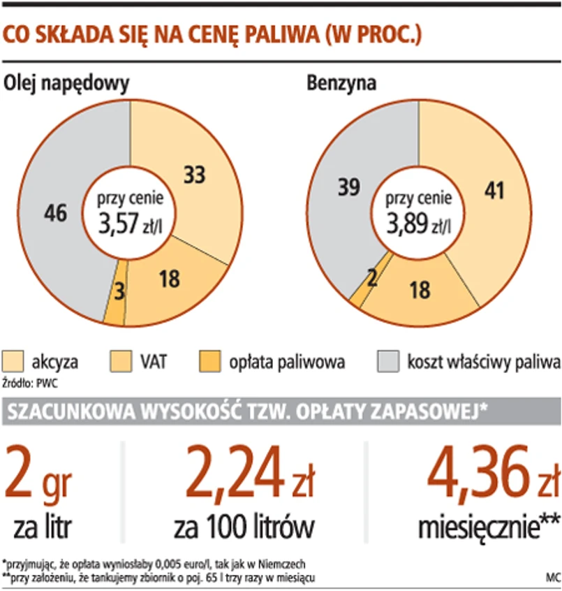 Opłaty funkcjonują już m.in. w Niemczech. Tam kierowcy płacą dodatkowo 0,005 euro za litr paliwa. Na razie nie wiadomo, jak wysoka opłata mogłaby być w Polsce. Analitycy przekonują, że gdyby zaimplementowano system niemiecki, ceny paliw na stacjach nie powinny wzrosnąć, ponieważ dziś, tankując na stacjach, już płacimy za tworzenie zapasów paliw, chociaż w inny sposób. – Obecny system zapasów wpływa na ceny detaliczne, tylko tego nie widać – przyznaje Rafał Miland.