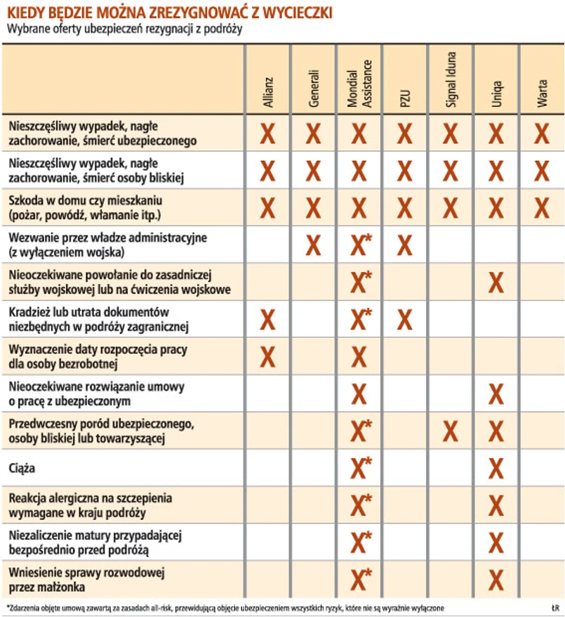 Nowością na rynku jest formuła all risk, czyli ubezpieczenia wszystkich ryzyk wprowadzona przez Mondial Assistance, która zakłada odpowiedzialność towarzystwa za wszystkie udokumentowane zdarzenia losowe, niezależne od klienta i uniemożliwiające mu wyjazd. – Uzasadnieniem odwołania wyjazdu może być nawet sytuacja, w której obecność pracownika jest niezbędna i musi odwołać urlop. W tym wypadku kluczowe będzie wydanie przez pracodawcę odpowiednio mocnego dokumentu uzasadniającego potrzebę zatrzymania pracownika – mówi Rafał Mrozowski z Mondial Assistance.