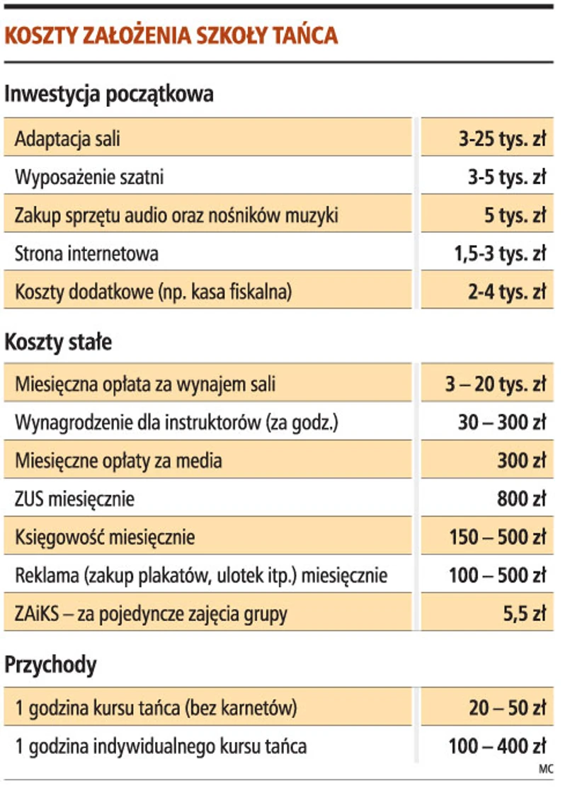 Na szkole tańca można dobrze zarobić. Niewielka szkoła może mieć zysk sięgający nawet 10 tys. zł miesięcznie. To możliwe dzięki temu, że ten biznes nie wymaga dużych nakładów inwestycyjnych. Są dwa podstawowe wydatki: wynajem sal oraz koszt wynagrodzenia instruktorów.