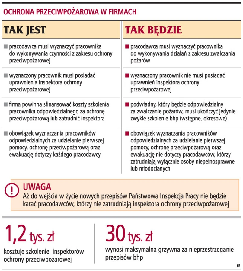 Wszystkie firmy, z wyjątkiem tych, które zatrudniają wyłącznie pracowników niepełnosprawnych lub młodocianych, będą musiały wyznaczać pracowników odpowiedzialnych za zwalczanie pożarów i ewakuację. Osoby te nie będą musiały, tak jak obecnie, posiadać uprawnień inspektora ochrony przeciwpożarowej. Wystarczy, że ukończą zwykłe przeszkolenie bhp.