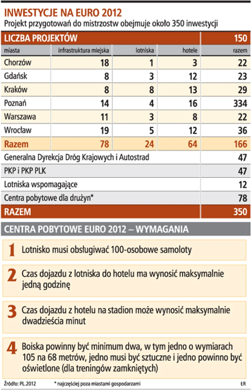 Pięć z sześciu miast ma już umowę z generalnym wykonawcą budowy stadionów. Jeszcze w tym miesiącu Chorzów chce wybrać firmę, która zmodernizuje Stadion Śląski. Najszybciej zbudują obiekty w Poznaniu i Krakowie, ale głównie z tego powodu, że ich modernizacja zaczęła się jeszcze przed przyznaniem Polsce Euro 2012. W ubiegłym tygodniu na plac budowy wszedł wykonawca Stadionu Narodowego, bez którego stracilibyśmy mistrzostwa. Kończą się prace fundamentowe i ziemne w Gdańsku i Wrocławiu. Te dwa ostatnie miasta na początku kwietnia podpisały umowy z generalnymi wykonawcami. W sumie na stadiony wydamy ponad 4 mld zł. Najwięcej na Stadion Narodowy – 1,4 mld zł.