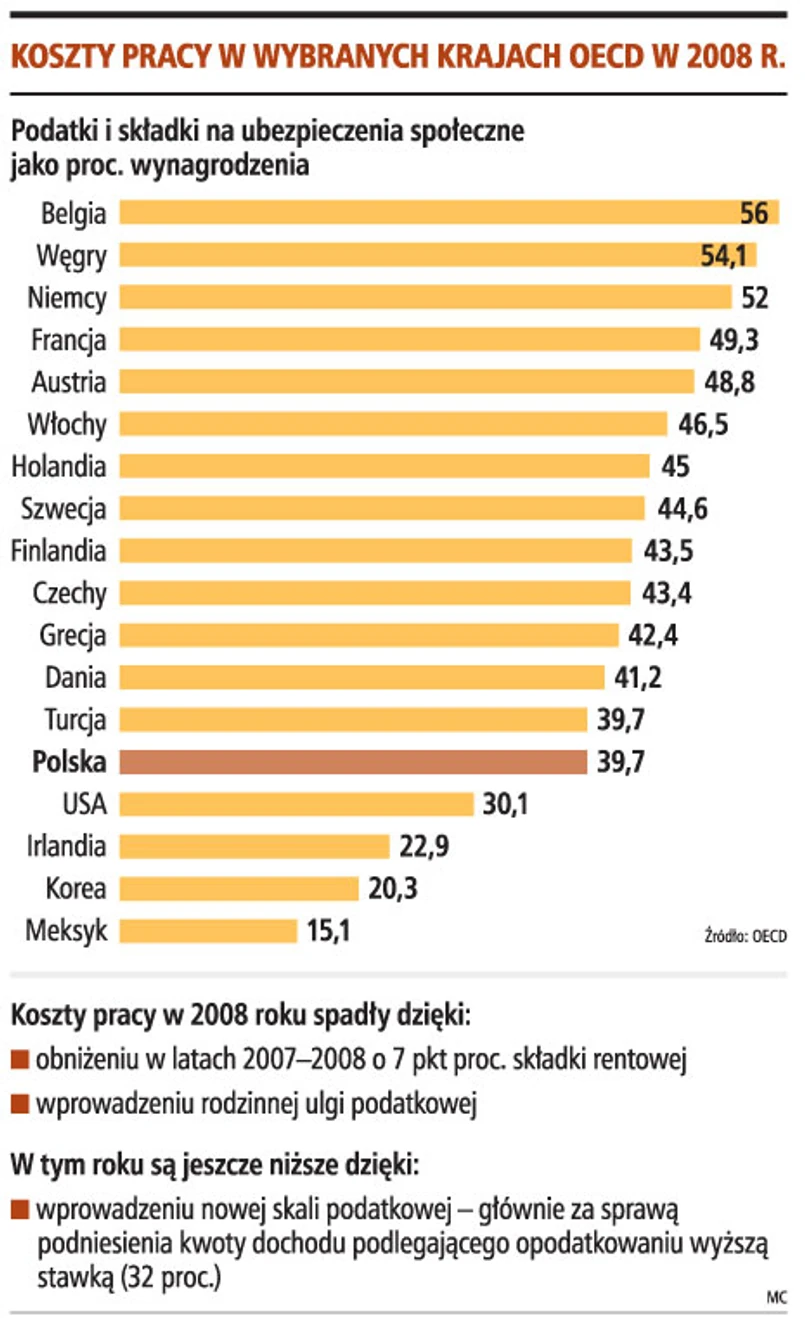 OECD analizuje, jak i w których krajach tej organizacji rosną lub maleją obciążenia płac. Bada, o ile rosną koszty wynikające z podatku dochodowego, składek na ubezpieczenia społeczne opłacanych przez pracowników i pracodawców. W tym zestawieniu, za 2008 rok, nasz kraj zdecydowanie się wyróżnia. W porównaniu do 2007 roku obciążenia płac zmalały aż o 3,2 pkt proc. (najwięcej z krajów OECD). W żadnym innym kraju (poza Turcją, Hiszpanią i Wlk. Brytanią) redukcja ta nie przekroczyła 1 pkt proc. Jeszcze lepiej jest, jeśli przyjrzymy się redukcji składek na ubezpieczenia społeczne. Zmalały one w naszym kraju aż o 3,8 pkt proc. W żadnym innym kraju redukcja ta nie przekroczyła 1 pkt proc.