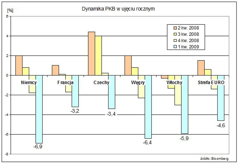 Niekorzystnie dla kondycji polskiej gospodarki wyglądają również dane, które napłynęły z Francji, która jest również naszym dużym partnerem handlowym. W I kwartale tego roku francuski PKB spadł w porównaniu do ostatniego kwartału 2008 roku o 1,2 procent. W ujęciu rocznym PKB Francji spadł o 3,2 procent.