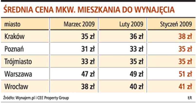 Na rynku pojawiło się więcej mieszkań do wynajęcia, więc ich ceny ustabilizowały się, a nawet zaczęły spadać. W pierwszych miesiącach 2009 roku w największych miastach w Polsce zanotowano kilkuzłotowe obniżki ceny metra kwadratowego do wynajmu. Zazwyczaj było to od 2 do 4 zł za mkw. Przy 50-metrowym mieszkaniu daje to najemcy nawet 200 zł oszczędności miesięcznie, a wynajmującemu tyle samo straty.