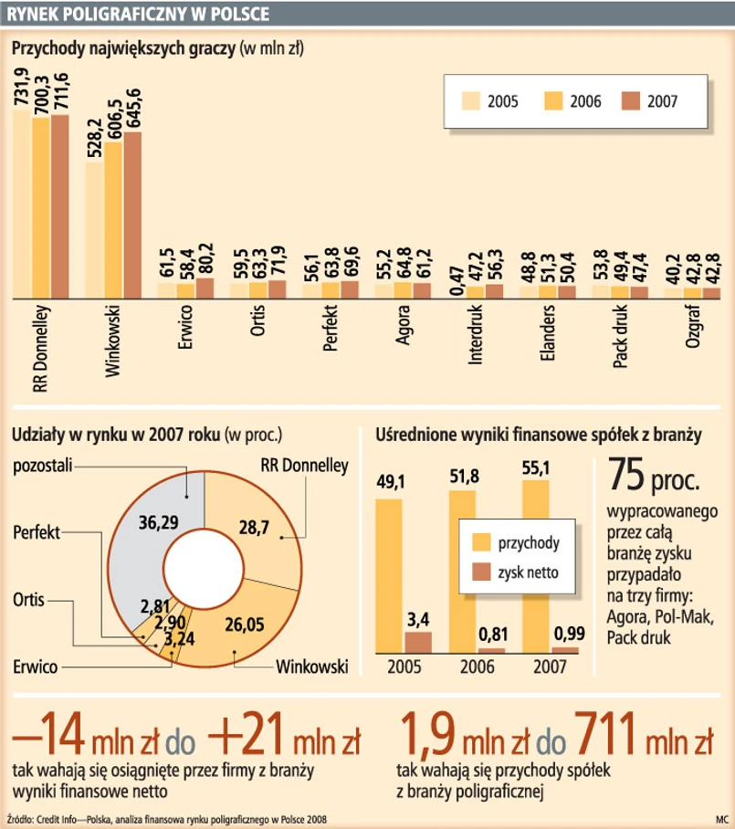 Nikt dokładnie nie policzył do tej pory wartości rynku usług poligraficznych w Polsce. Danych za 2008 rok nie ma żadnych. W ciągu trzech lat, do 2007 roku, wartość tego rynku rosła średnio o 5–6 proc. rocznie.