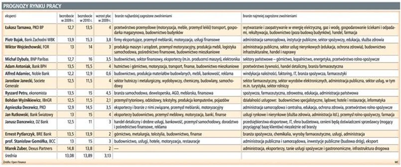 Eksperci różnią się co do terminu, kiedy nasza gospodarka będzie miała się lepiej. Stąd różnice w prognozach na koniec 2010 roku. Zdaniem prof. Stanisława Gomułki wzrost gospodarczy w Polsce w tym i w przyszłym roku będzie w okolicach zera, czyli będzie oscylował między -1 a 1. – Stopa bezrobocia z 12 proc. na koniec tego roku wzrośnie do 15 proc. – ocenia prof. Stanisław Gomułka. Podobne jak on prognozuje większość analityków. Także oni przewidują wyższą stopę bezrobocia w grudniu przyszłego roku w porównaniu z grudniem bieżącego roku. Zdaniem Michała Dybuły z BNP Paribas stopa bezrobocia w 2010 roku wyniesie nawet 16 proc.