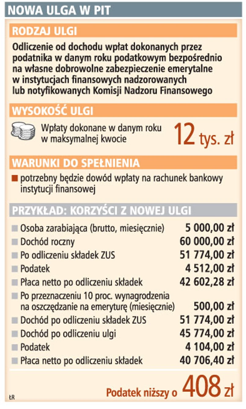 Zdaniem ekspertów taka ulga to dobry pomysł, ale w większości przypadków skorzystają z niej najbogatsi, którzy będą mieć środki na oszczędzanie na przyszłą emeryturę. Co więcej, maksymalny limit nowego odliczenia – 12 tys. zł – zostanie wykorzystany w jednostkowych sytuacjach. Aby bowiem taką sumę odłożyć w ciągu roku, miesięcznie na ten cel trzeba będzie przeznaczyć ok. 1 tys. zł.