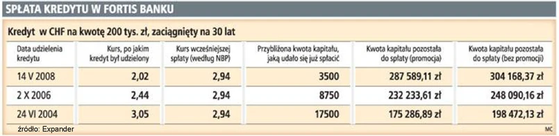 Fortis Bank jako jeden z pierwszych banków w Polsce wycofał się z udzielania kredytów w szwajcarskiej walucie. Było to już w maju ubiegłego roku, czyli na kilka miesięcy przed rozpoczęciem kryzysu finansowego w Polsce. Dzisiaj Fortis Bank jako pierwszy bank zachęca klientów do wcześniejszej spłaty kredytów walutowych. W ramach promocji bank nie pobiera marży przy wcześniejszej spłacie kredytu. W praktyce oferta skierowana jest do tych, którzy pożyczkę w banku wzięli w ciągu ostatnich trzech lat. Do tej pory bank pobierał przy wcześniejszej spłacie takich kredytów prowizję w wysokości 1,5 proc. wartości pożyczki. W ramach tej samej promocji wcześniejsza spłata dokonywana jest teraz w Fortis Banku według kursu średniego NBP.