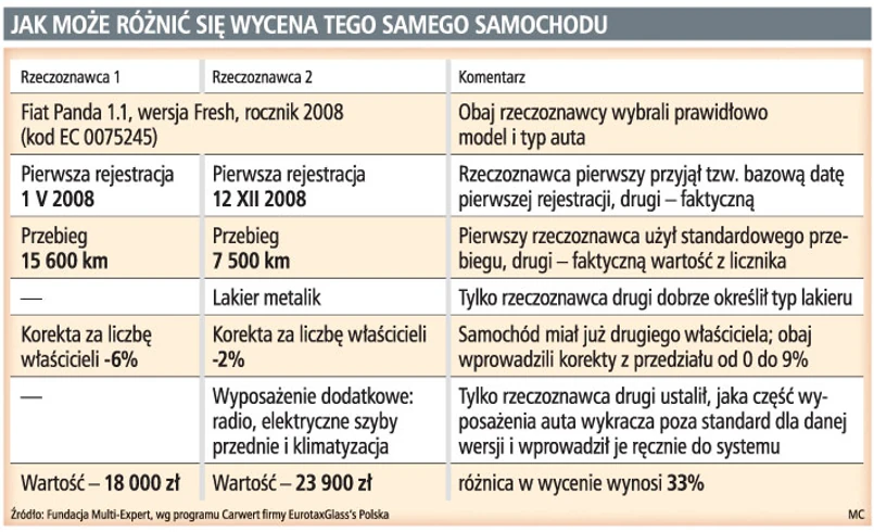 Nawet o 33 proc. może się różnić wycena samochodu sprzed szkody, w zależności od tego, kto i jak będzie jej dokonywał – wynika z symulacji przygotowanej dla GP przez Fundację Multi-Expert. Podany przykład dotyczy dwóch ekstremalnych sytuacji.