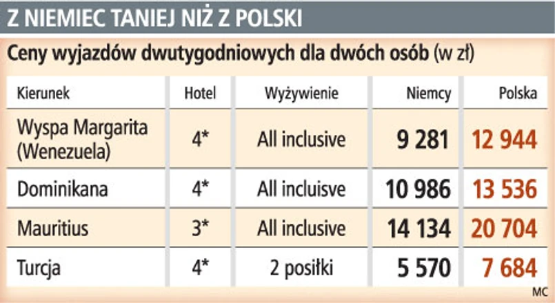 Ceny wycieczek są porównywalne. Do hotelu Happy Life Village w Sharm El Sheikh z Polski polecimy za 2386 zł od osoby, a z Zurychu za 2331 zł. Tamtejsze biura posiadają większe możliwości negocjacyjne w rozmowach z przewoźnikami. Do tego do wielu miejsc na świecie z Berlina czy Frankfurtu jest bliżej. – Można znaleźć naprawdę bardzo korzystne cenowo oferty. Szczególnie na kierunkach egzotycznych, najczęściej w okolicy Basenu Morza Karaibskiego oraz Afryki – zauważa Anna Zielińska. Jak dodaje, z Polski wyjazd do czterogwiazdkowego hotelu na Wyspie Margarita w Wenezueli na dwa tygodnie dla dwóch osób kosztuje 12 944 zł. Dla porównania, lecąc z Niemiec, wydamy 9281 tys. zł.