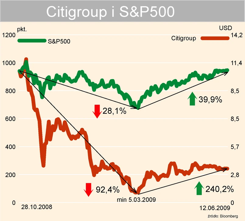 Obecne wysokie stopy zwrotu na państwowej „inwestycji” w Citigroup mogą jednak szybko wyparować. Amerykańskie instytucje państwowe, w tym Departament Skarbu i Rezerwa Federalna, udzieliły Citi gwarancji w wysokości 301 miliardów dolarów. I o tyle może właśnie wzrosnąć zaangażowanie państwowych środków w upadłego bankowego giganta, jeśli bankowi nie uda się „wyjść na prostą”.