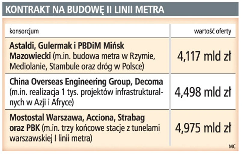 Poza Mostostalem protest złożyła również China Overseas Engineering Group z Państwa Środka, która zaproponowała blisko 4,5 mld zł. Chińczycy twierdzą, że zwycięska firma m.in. nienależycie udokumentowała swoje doświadczenie w budowie podziemnej kolejki. Metro odrzuciło protesty. Firmy odwołały się więc do Krajowej Izby Odwoławczej przy prezesie Urzędu Zamówień Publicznych. Dziś o godz. 10 rozpatrzony zostanie protest Chińczyków.