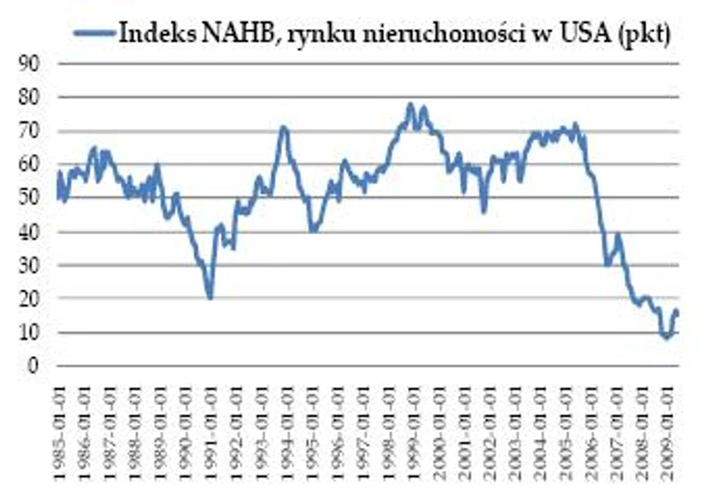 Indeks NAHB, obrazujący oceny kondycji rynku nieruchomości w USA przez specjalistów z tej branży, odnotował w czerwcu spadek i tym samym przerwał proces poprawy, jaki występował w poprzednich miesiącach. Trudno więc mówić o trwałości poprawy, a jednocześnie jej dotychczasowa skala jest bardzo ograniczona. Wskaźnik w dalszym ciągu jest na poziomie niższym niż w dołku osiągniętym na początku lat 90. Tym samym mamy potwierdzenie, że na rynku nieruchomości w USA wciąż nie ma żadnego przełomu.