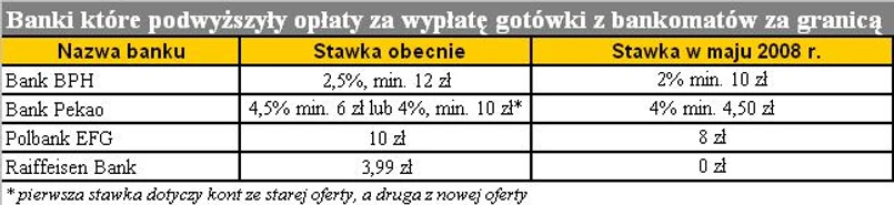 W większości banków opłata za wypłatę środków z obcych bankomatów nie zmieniła się w porównaniu z sytuacją sprzed roku. Tylko 4 banki zdecydowały się na podwyższenie prowizji. Są to Bank BPH, Pekao, Polbank i Raiffeisen Bank. Najbardziej zdziwieni mogą być klienci tego ostatniego, gdyż w ubiegłym roku nie płacili nic, a obecnie każda wypłata będzie ich kosztowała 3,99 zł.