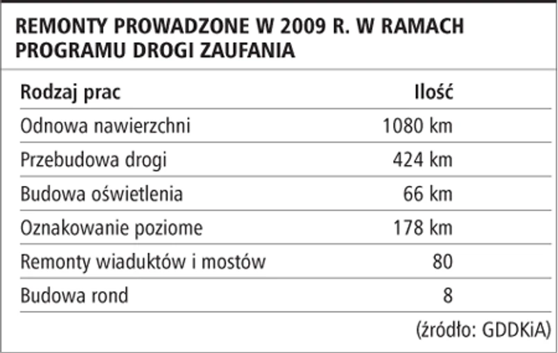 Program „Drogi Zaufania” powstał, by chronić życie i zdrowie użytkowników dróg krajowych. Jego celem jest zmniejszenie do 2013 r. liczby śmiertelnych ofiar wypadków na drogach krajowych o 75 proc. Obecnie na polskich drogach średnio na 100 wypadków śmierć ponosi w naszym kraju aż 11 osób, podczas gdy we Francji czy Czechach – sześć, a w Niemczech i Austrii – zaledwie dwie. „Drogi zaufania” to pierwszy kompleksowy program poprawy bezpieczeństwa drogowego w Polsce. Składa się przede wszystkim z prac inżynieryjnych, które mają poprawić bezpieczeństwo kierowców, pieszych i rowerzystów. W wielu miejscach wymieniana jest nawierzchnia, remontowane są zatoki autobusowe, układane są chodniki, powstają ścieżki rowerowe, montowana jest sygnalizacja świetlna. Efektem jest obniżenie liczby zabitych z 493 w I kwartale 2008 roku do 317 w 2009 roku i liczby wypadków z 2588 do 2017.
