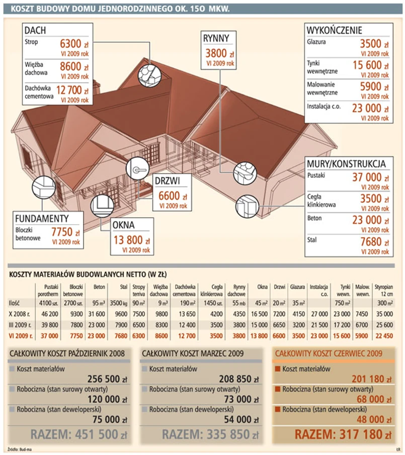 Według ekspertów czeka nas więc okres stabilnych cen w budownictwie jednorodzinnym. Już ostatnie trzy miesiące przyniosły tylko niewielkie zmiany. Na pewno nie ma już sytuacji, w której każda nowa dostawa towaru do składu budowlanego jest tańsza. W ostatnim czasie staniały jeszcze nieco materiały ścienne, styropian, tynki oraz stolarka okienna. Z drugiej strony niektóre materiały budowlane w ostatnim czasie zdrożały. Więcej trzeba zapłacić za drewno na więźbę dachową (750–850 zł za m3), za dachówki cementowe (26–28 zł/szt.), glazurę i instalację wodno-kanalizacyjną. Nasze cokwartalne zestawienie dotyczy kosztów budowy przeciętnego domu w okolicach Poznania. Ceny materiałów budowlanych, a przede wszystkim koszty robocizny, w różnych regionach Polski mogą być oczywiście bardzo różne. Podajemy więc ceny orientacyjne. Na pewno w okolicach Warszawy domu w takiej cenie, jak podana w naszym zestawieniu, nie wybudujemy, ale te stawki mogą być punktem odniesienia w rozmowach z wykonawcą.