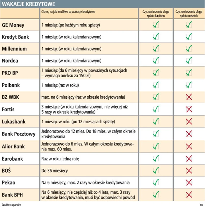 W większości banków karencja dotyczy jednej raty w ciągu roku. Są też takie instytucje, w których można zawiesić spłatę kredytu na rok. Tak jest w Banku Pocztowym. W BZ WBK, Banku BPH, Pekao i Alior Banku przerwa może dotyczyć sześciu rat na rok. W BOŚ-u określony jest jedynie maksymalny okres wakacji kredytowych w całym okresie kredytowania – 36 miesięcy. W Alior Banku łączne wakacje kredytowe mogą wynieść do pięciu lat. Analitycy nie radzą jednak korzystać z tak długiej przerwy, bo oznacza to wzrost kosztu pożyczki.