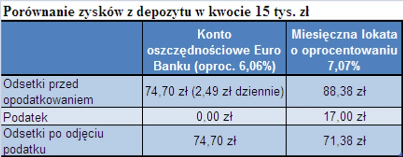 Euro Bank, choć zdecydował się na obniżenie oprocentowania konta oszczędnościowego z 7,07% do 6,06%, zmienił częstotliwość naliczania odsetek na koncie. Wcześniej odsetki były wypłacane co miesiąc, a obecnie są wypłacane codziennie. Dzięki temu klient, który posiada na koncie nie więcej niż nieco ponad15 tys. zł w ogóle nie płaci podatku od odsetek. W rezultacie klienci otrzymują więcej odsetek, niż przy poprzednim, wyższym poziomie oprocentowania. Ponieważ bank pozwala otworzyć do pięciu kont oszczędnościowych, to bez podatku można ulokować nawet 75 tys. zł.