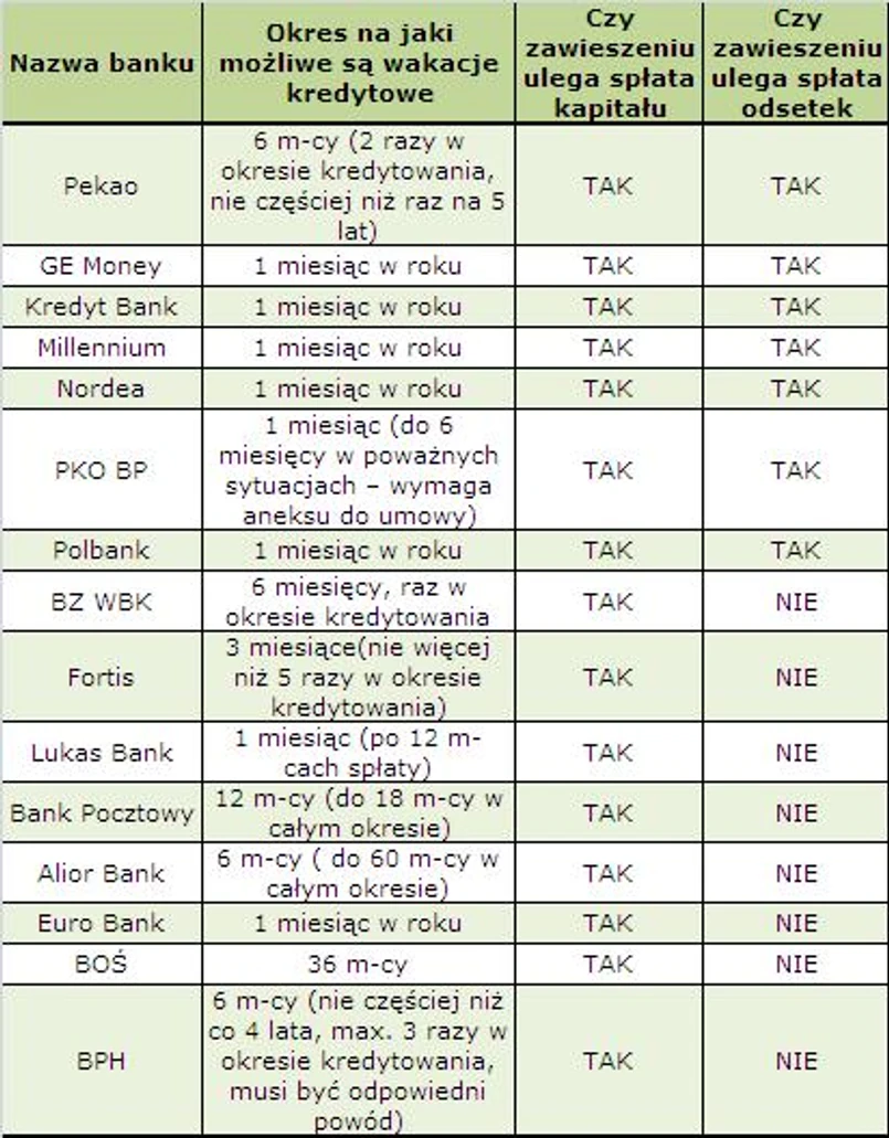 Bankiem, który udziela najdłuższych wakacji kredytowych jest BOŚ, w którym mogą one trwać nawet 36 miesięcy, ale zawieszeniu ulega tylko spłata kapitału. Drugim pod tym względem jest Bank Pocztowy, w którym można nie płacić kapitału przez 12 miesięcy (odsetki trzeba jednak spłacać). Są to jednak nieliczne wyjątki. Zwykle, jeśli okres jest dłuższy niż miesiąc, to jest to sześć miesięcy (np. BZ WBK, Alior, BPH). Najgorszą ofertę wakacji posiadają natomiast Euro Bank i Lukas Bank, w których można zawiesić tylko kapitał i tylko na miesiąc.