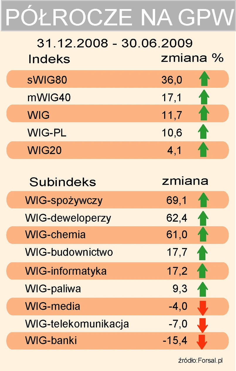 Najwięcej zyskał wskaźnik małych spółek sWIG80. Od końca grudnia 2008 jego wartość zwiększyła się o 36 proc. Najmniej - o 4,1 proc. zwyżkował WIG20.
