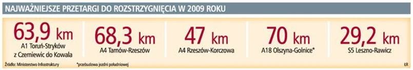 W tym roku drogowcy zamierzają jeszcze rozstrzygnąć kilka wielkich przetargów. Pojawią się wykonawcy fragmentów autostrad A2 (92 km do Warszawy), A4 (w sumie 115 km trasy) oraz A1 (64 km).