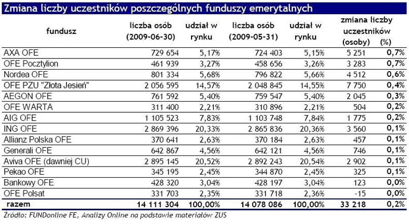Jednym podmiotem emerytalnym, który w porównaniu z miesiącem wcześniejszym zanotował zmniejszenie liczby uczestników (-15 osób) był OFE Polsat.