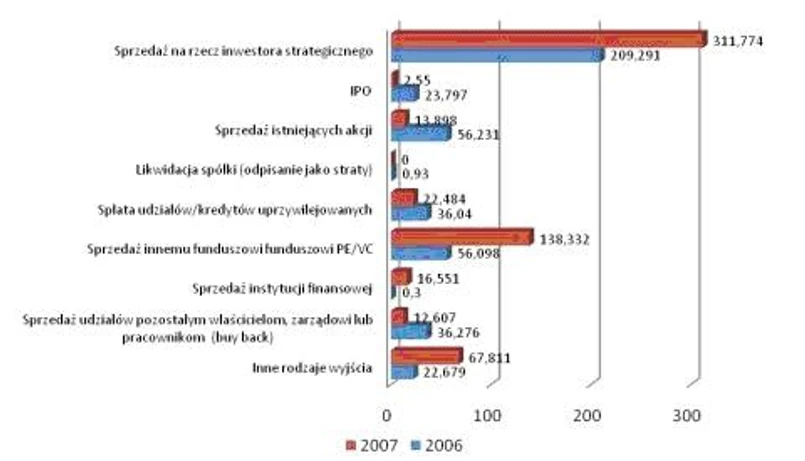 W pewnym momencie nadchodzi jednak moment pożegnania. Sposobów rozstania z funduszami PE/VC jest bardzo wiele, jednakże popularność poszczególnych form dezinwestycji jest bardzo różna. Na wykresie poniżej zaprezentowane zostały poszczególne formy rozstania z funduszem wraz z wartościowym zestawieniem popularności poszczególnych rozwiązań.