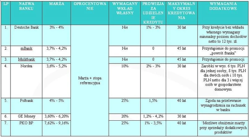 Nadal można uzyskać kredyt na 100% wartości zakupywanej nieruchomości i to nie tylko w złotówkach. W trzech bankach jest możliwy do zyskania również we frankach szwajcarskich i EURO, mianowicie w Deutsche Banku, mBanku i Multibanku. Dodatkowo, w mBanku i Multibanku można również wnioskować o kredyt w USD. Osoby zainteresowane uzyskaniem takiego kredytu w złotówkach mają jeszcze większy wybór. Kredyt w złotówkach bez wymaganego wkładu własnego oferują bowiem: Deutsche Bank, Eurobank, Lukas Banku, mBanku, Multibanku, PEKAO i PKO BP.
