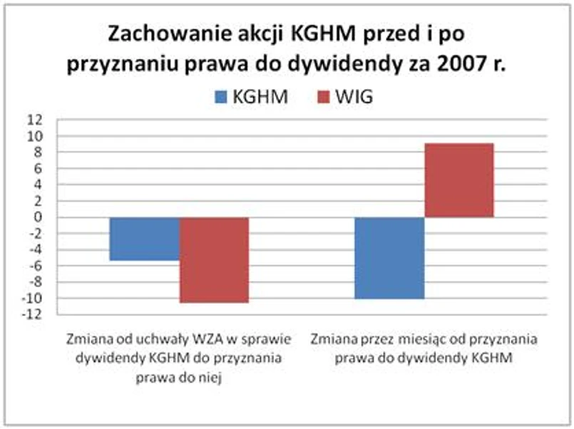 Wydarzenia z minionego roku dają do myślenia. Pierwszego dnia po odjęciu prawa do dywidendy w wysokości 9 zł walory miedziowego kombinatu potaniały o 10,65 zł, a przez kolejne 4 tygodnie poszły w dół o dalsze 10%. W tym czasie indeks WIG zyskał 9,1%. Przed przyznaniem prawa do dywidendy papiery spółki zachowywały się natomiast o połowę lepiej niż cały rynek. Dywidendę przegłosowano 26 czerwca 2008 r. Od tego czasu do ostatniego dnia notowania z prawem do dywidendy (15 lipca 2008 r.) WIG spadł o 10,6%, PKN Orlen o 1,1%, a KGHM o 5,4%. Tym razem akcje lubińskiej firmy w okresie od przegłosowania dywidendy zachowywały się prawie tak samo, jak indeks WIG i znacznie gorzej od PKN Orlen, spółki również uzależnionej od notowań surowców.